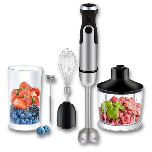 The 5-in-1 immersion blender offers greater versatility. Unlike a stationary blender, it allows you to blend directly in your containers (such as pots for soup) and includes attachments for chopping and whisking , thus taking up less space.